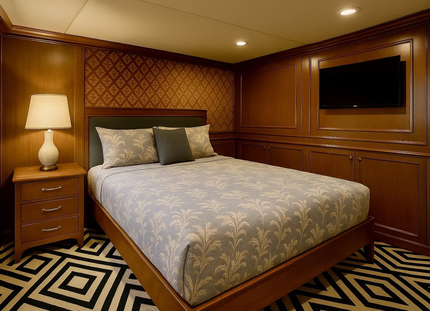 Booking option for couple. Includes queen bed, TV and shared ensuite. 240v power outlets. 2 large port hole windows. Situated on Lower Deck.